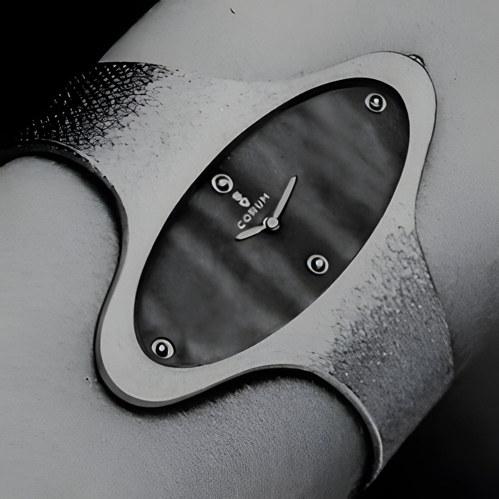 The yellow gold bracelet of this original design opens to encompass the wide jade-coloured oval dial, set with four tiger’s eye cabochons This transversal styling fits the wrist perfectly. (CORUM)