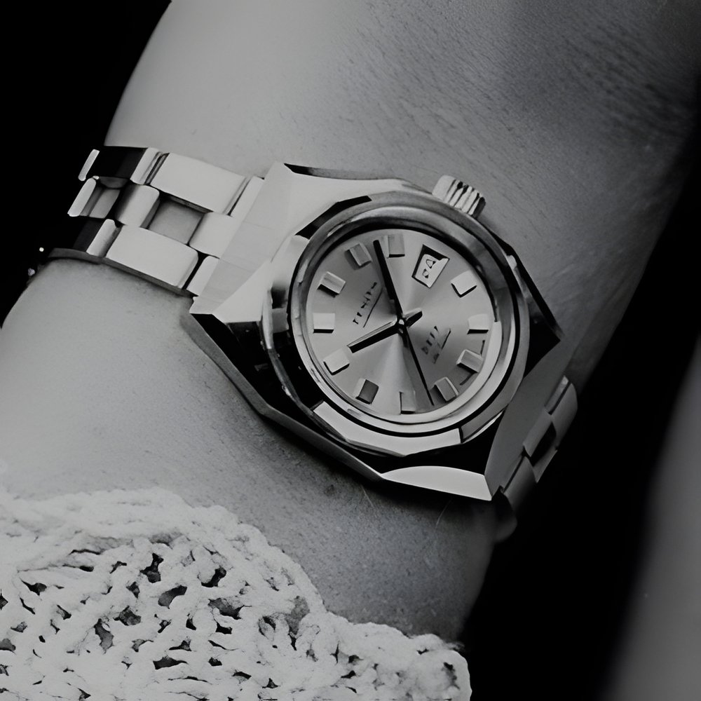 An example of the “composite shape”, blending straight and curved lines The stylish elegance of this sports model belies the ruggedness of the movement lodged inside. It is automatic, has a shockprotection system and water-resistant case In 18 carat yellow gold. (ZENITH "Defy)