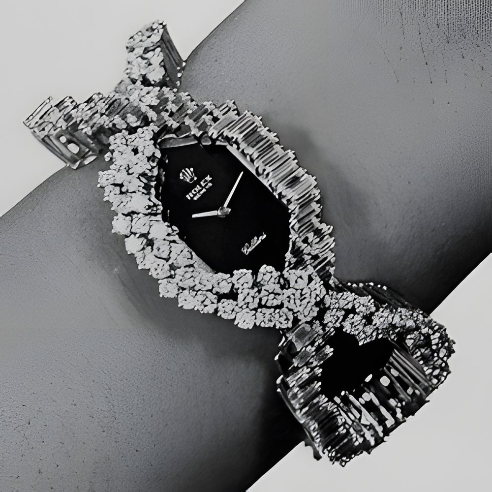 The prestige of jewellery-watches. Generous expanses of diamond surround the “mirrored” dial : baguette-cut on one side, brilliantcut on the other. The same arrangement is found on the bracelet, another manifestation of the styling unity typical of “Montres et Bijoux” 1970. 159 brilliant-cut and 145 baguette-cut diamonds in all, platinum frame. (ROLEX)
