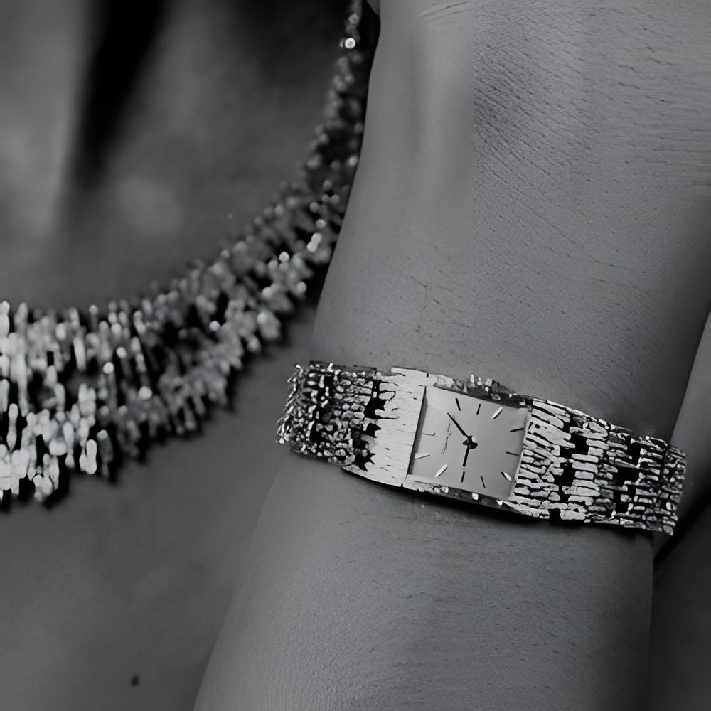 A jewellery ensemble comprising a wristwatch, a necklace and ear clips, all in 18 carat yellow gold. The surface treatment stresses sheened areas, one of the novel trends at this year’s “Montres et Bijoux”. Numerous flexible, openworked, articulated elements. The watch shows great styling unity and has a wide dial aperture. (BUECHE-GIROD)