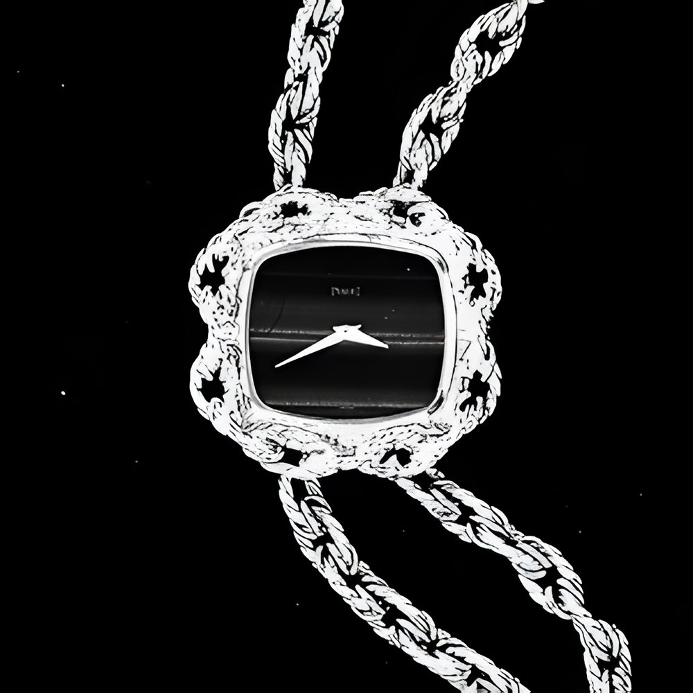 An opulent and original creation. The watch hangs from a pendantnecklace of generous proportions : a gold chain with finely worked links. Tiger’s eye is used for the dial and for the two spheres which end the pendant. (PIAGET)