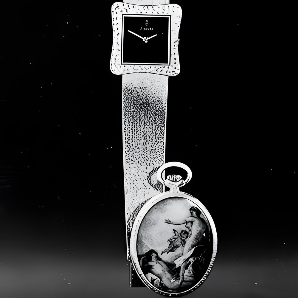 Here are two Corum models. The dark blue dial of the jewellery watch is framed with 164 cobble-set brilliants; the grey gold band is engraved on its entire surface. A Geneva enamel miniature inspired by Jean-Baptiste Vanloo decorates the graceful oval pocket watch in 18 carat yellow gold. (CORUM)