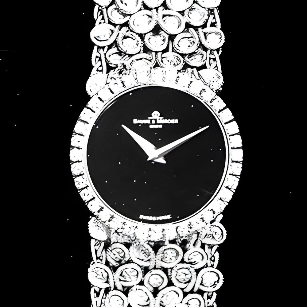 A jewellery-watch with a remarkably handsome and original bracelet designe Tiny engraved “nuggets” are held in place by delicate grey gold wire mesh. Brilliants crown the coloured dial. (BAUME & MERCIER)