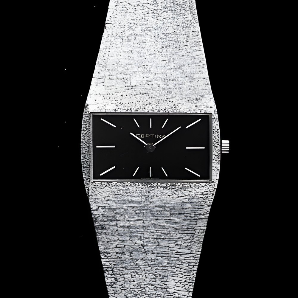 This jewellery—watch provides a classical expression of the “Full Flow” line. The dark blue dial’s rectangular aperture barely influences the engraved grey gold bracelet’s lines. (CERTINA)