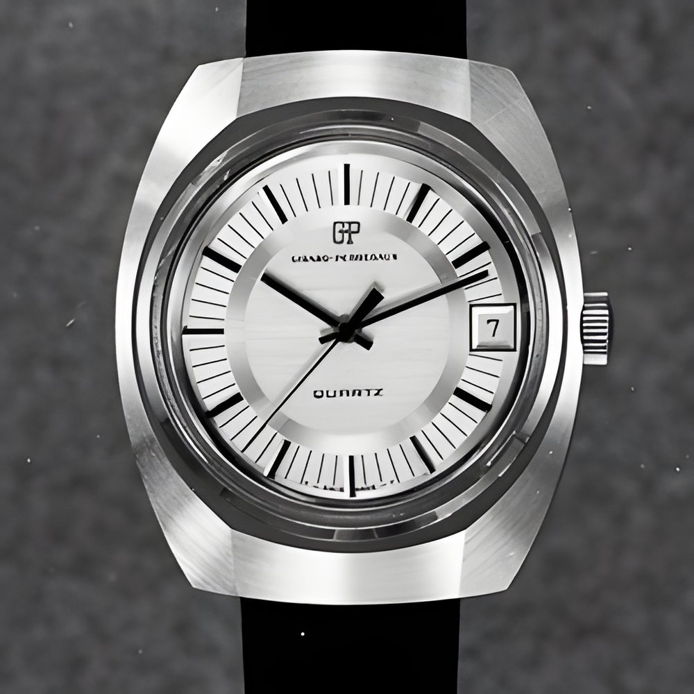 “Montres et Bijoux” is also a test-bench for models influenced by industrial design. This Girard- Perregaux watch, for example, is built around the new quartz electronic movement which was to have been marketed next year. Its styling is neat and restrained with integrated leather strap Dial with very legible time divisions (GIRARD-PERREGAUX Quartz)