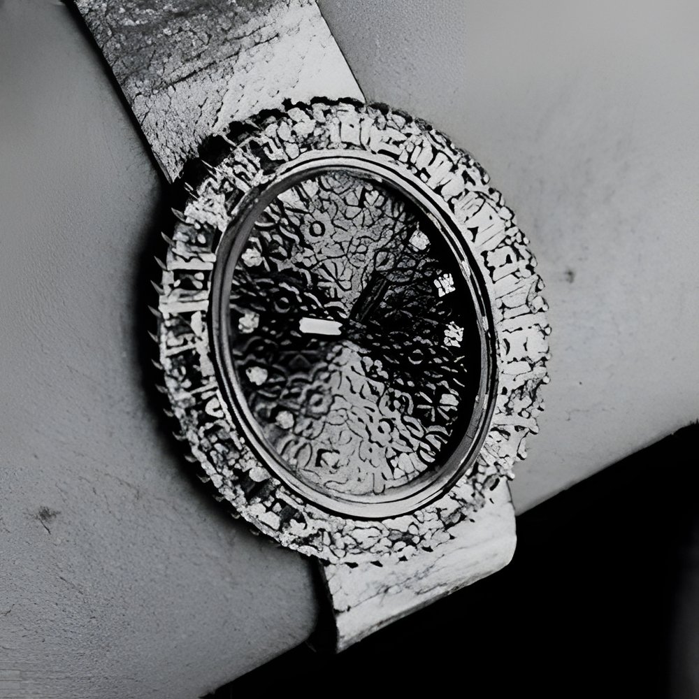 One of the prestigious designs of the ’Montres et Bijoux“Exhibition. The grey gold case’s elegant lines are stressed by a”claw-set" crown of diamonds. On the blue Florentine-decor dial, brilliants mark the hours Even the tiny hands are diamondstudded, an Audemars Piguet speciality. (AUDEMARS PIGUET)