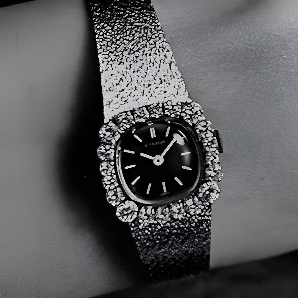 A gracefully proportioned model in masterful classical style. 20 large brilliants frame the dark blue dial. Bracelet in grey gold. (ETERNA)