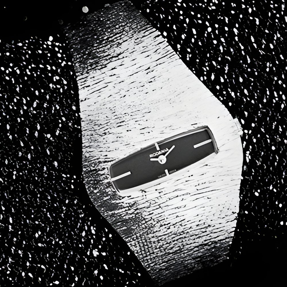 A perfect expression of the “Full Flow” line is this model, in reality a finely chased grey gold bracelet with an aperture for the blue dial. (RODANIA)