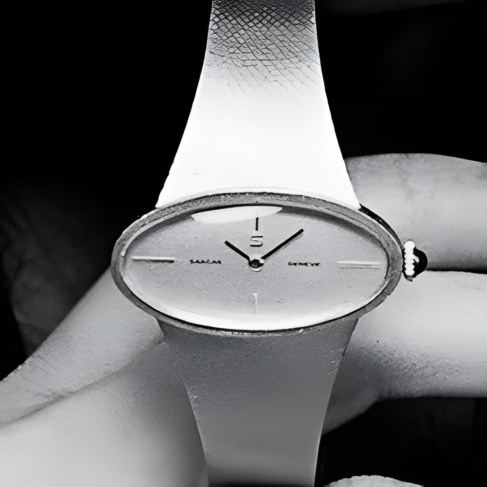 A lady’s watch in the mainstream of the new “Full Flow” design : neat, pure lines and complete integration of bracelet, case and dial In 18-carat yellow gold. Note the transversal position of the oval case, a now classical arrangement. (SARCAR)