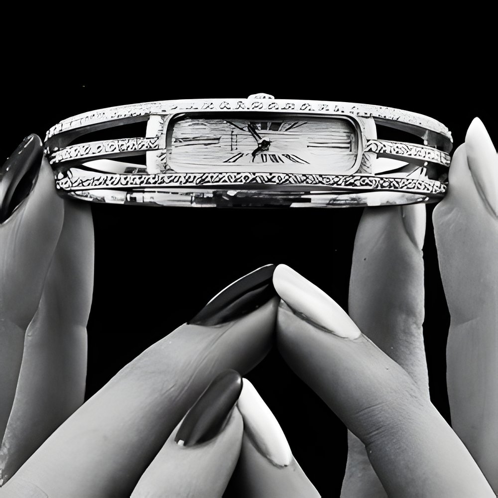 A graceful representative of the “Full Flow” line is this baguette watch enhanced by rows of brillants set along the case and the bracelet’s three branches. Long, engraved, silvered dial, with delicate Roman numerals. In grey gold. (UNIVERSAL)