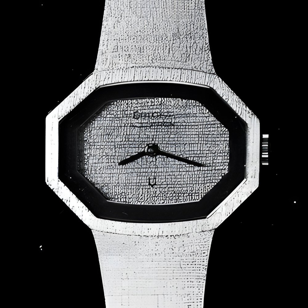 Typical Of the “Full Flow” line, this jewellery watch features clean and unornËmented lines. The 18 carat grey gold bracelet’s finely chased surface design continues on the dial, also in grey gold. With the rectangular case’s cut corners, sharp angles stage a bold comeback. Lapis lazuli decor sets off this styling concept. Miniature electronic movement, with tuning fork. (BULOVA Mini-Accutron)