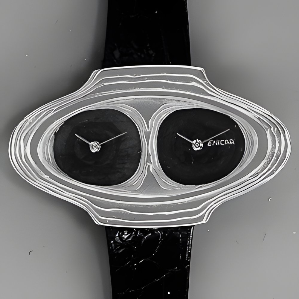 An original twin-dial movement for all those who need the time in two different time zones. Silver case with broadstroke engraving, designed for perfect integration of the leather strap. Coloured dials. (ENICAR)