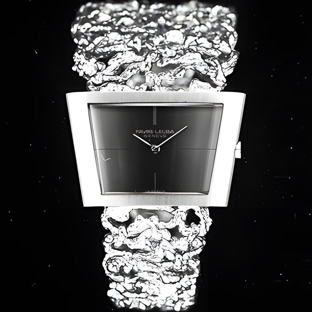 The smoked quartz crystal protecting this model’ s dial also serves a decorative purpose, providing a note of colour. Both the polished, trapeze-shaped case and the bracelet, completely handcrafted, are in 18 carat grey gold. (FAVRE-LEUBA)