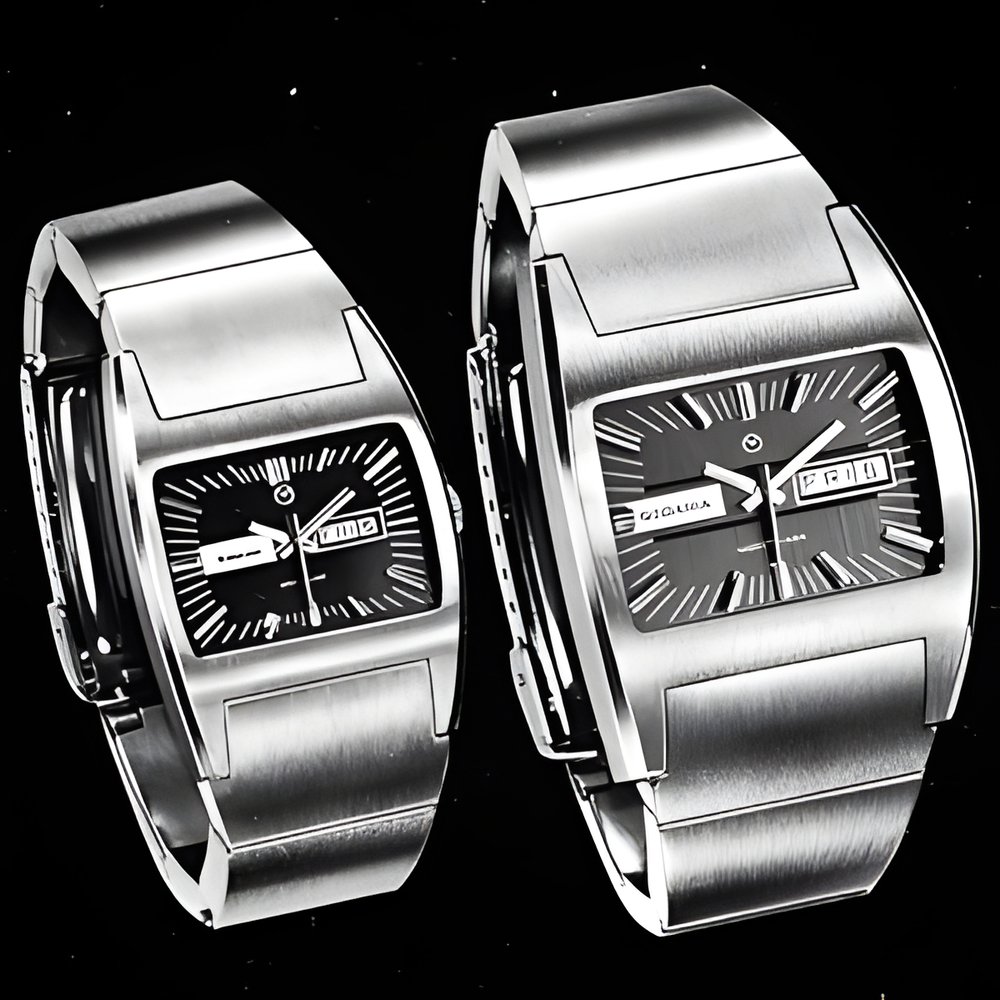 Perhaps influenced by the Olympic Games, sports watches have put in an appearance at “Montres et Bijoux”, with currently fashionable “Full Flow” styling. Forming a couple, these models both have an integrated bracelet and wide dial with precise time indications. They are fitted with an automatic movement and a day-date calendar. (RODANIA)