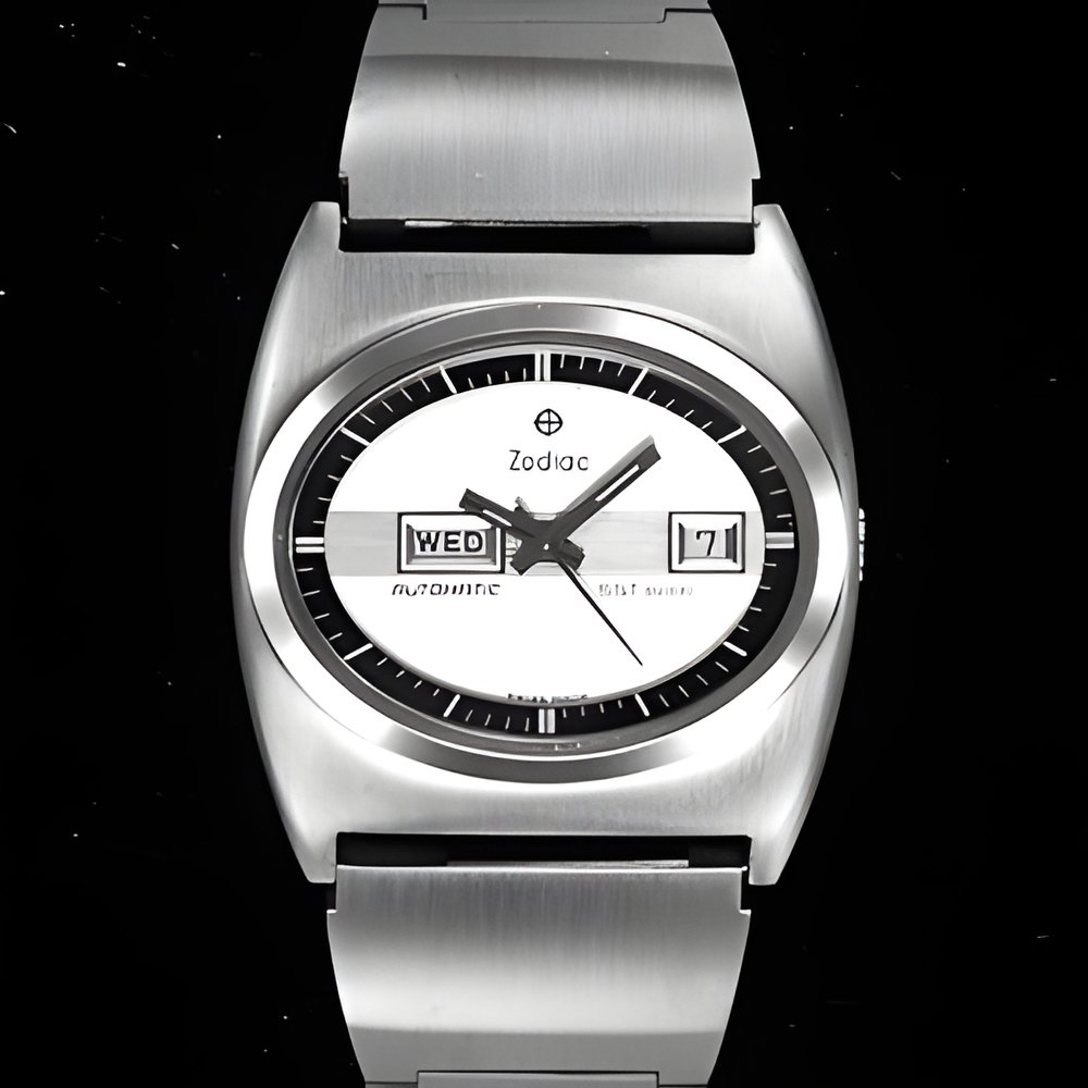 Bold yet softly rounded lines on this man’s watch which is also notable for the transversal oval of its zoned dial. High frequency (36,000 v.p.h.) automatic movement and day-date calendar. (ZODIAC “SST”)