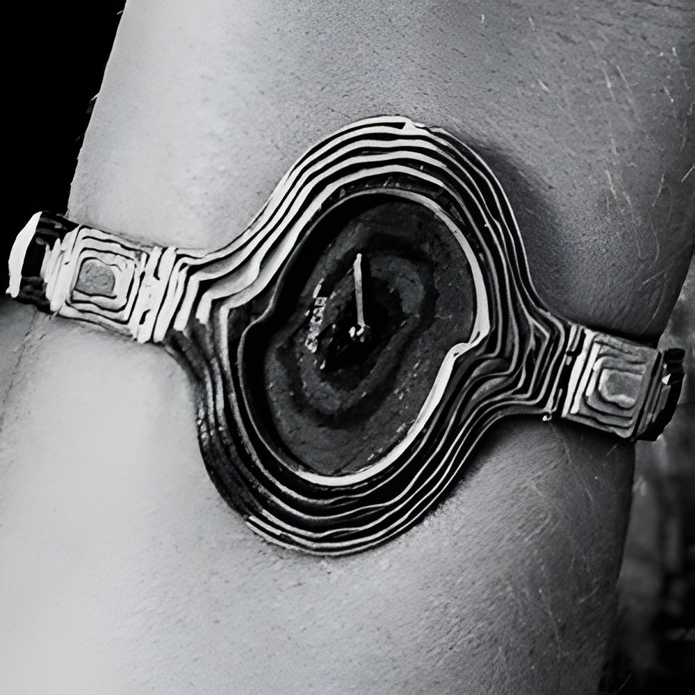 One of the new trcnds unveiled at “Montres et Bijoux” : a very narrow bracelet issuing directly from the casu. Broadstroke engraving on every element contributes to the model ’ s co-ordinated styling. The dial has a series of concentric colour zones. In 18 carat yellow gold. (ENICAR)