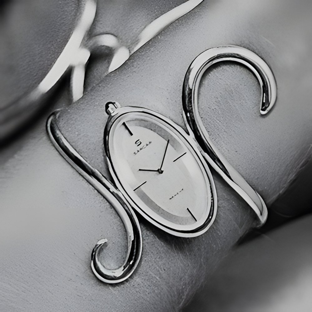 A jewellery set in polished silver comprising a ring, a necklace and a watch. The oval case is set between the rigid bracelet’s graceful curves. The winding crown, tipped with a sapphire cabochon, is placed at 12 o’clock. (SARCAR)