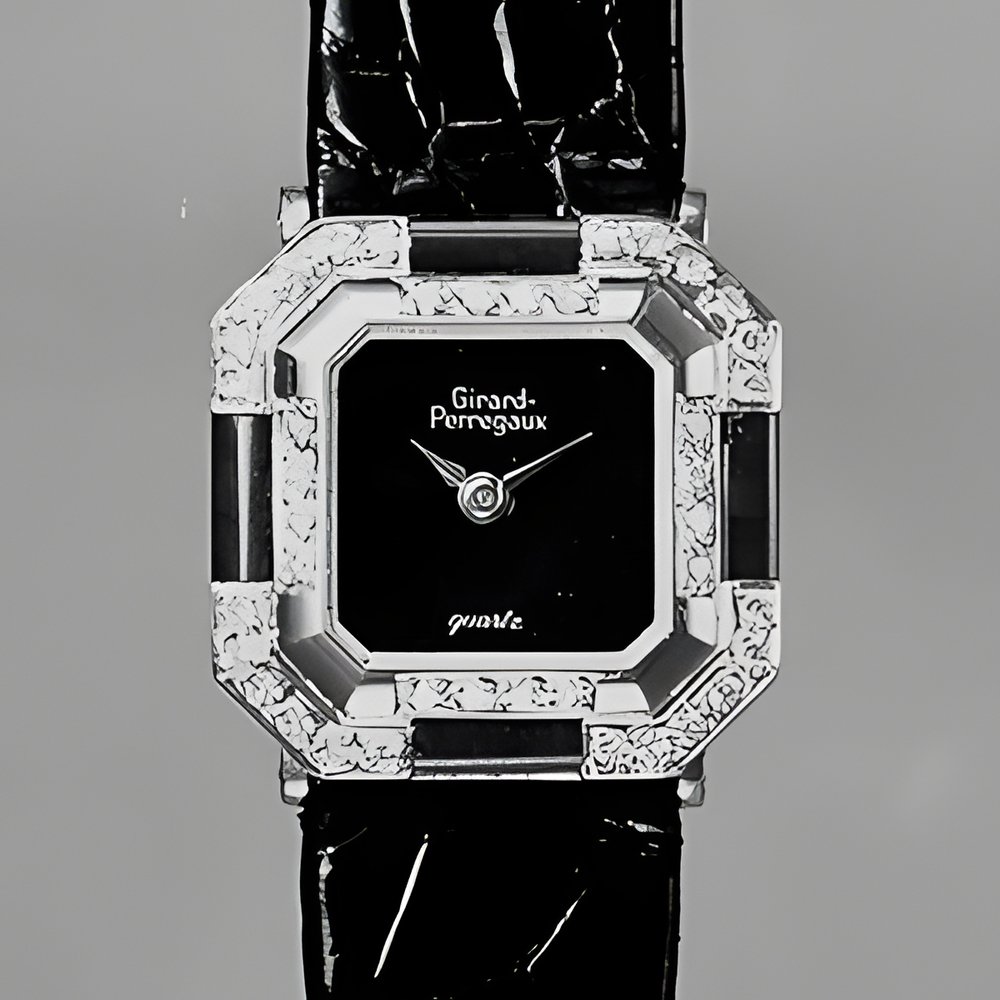 Square case lines with cut corners, stepped bezel, graceful decor - all typical of the latest watch fashions. Diamonds and small lapis-lazuli plaques set in 18K yellow gold, lapis-lazuli dial. Small dimensions thanks to a new quartz movement whose diameter and volume are the smallest to date. (GIRARD-PERREGAUX)