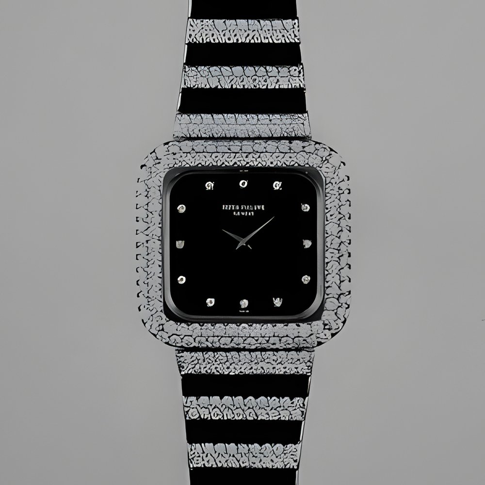 Diamonds and red agate distinguish this Patek Philippe design. 500 brilliant-cut diamonds (7-51 ct) are set in double rows on the bracelet and bezel, alternating with rods of red agate. The dial, also red agate, features diamond hour markers The frame is 18K yellow gold. (PATEK PHILIPPE)