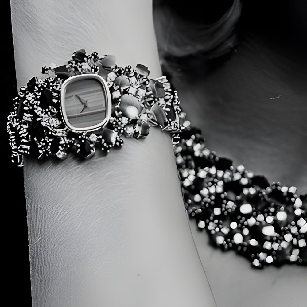 18K yellow gold jewellery set comprising a necklace and a wristwatch. The decoration is composed of a series of elements alternately set with malachite, onyx and diamonds. This entry marks the first time the Paul Buhré company has taken part in the “Montres et Bijoux de Genève” exhibition. (PAUL BUHRE)