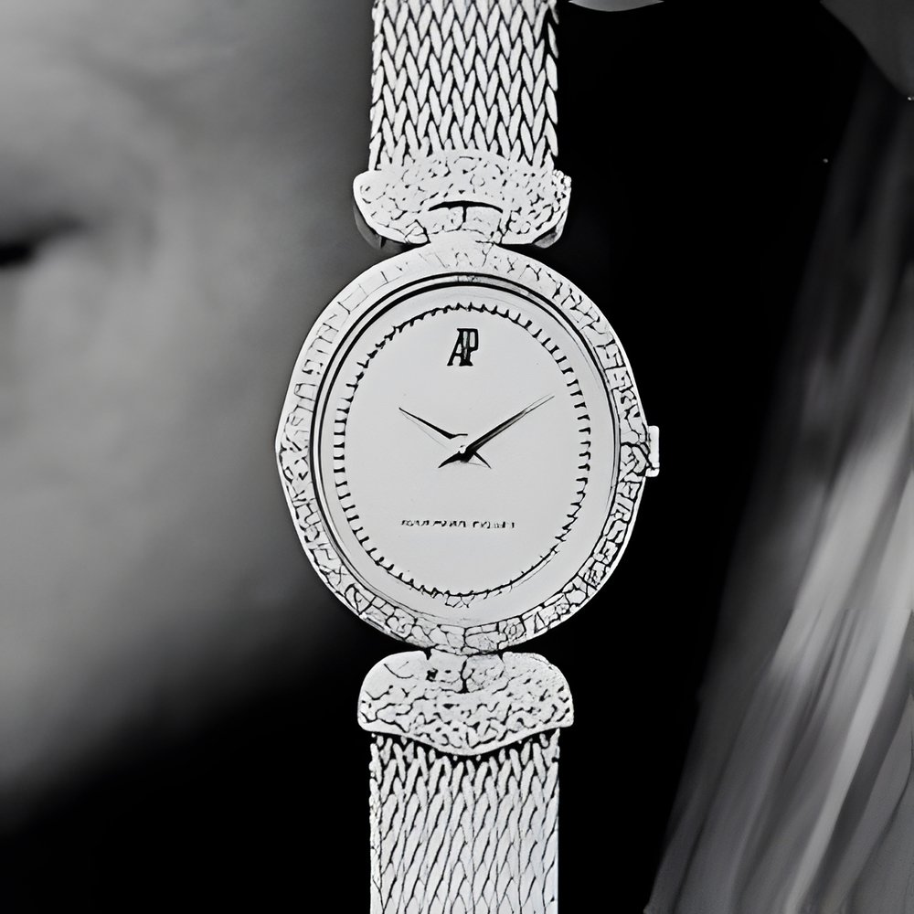 Softly rounded lines, frosted, beaded gilt dial framed by an elegantly engraved motif , diamond-set bezel, silky mesh bracelet with stirrup-like clasp set with diamonds - this 18K yellow gold Audemars Piguet model eloquently expresses the character and elegance of the new designs unveiled at “Montres et Bijoux” 1978. (AUDEMARS PIGUET)