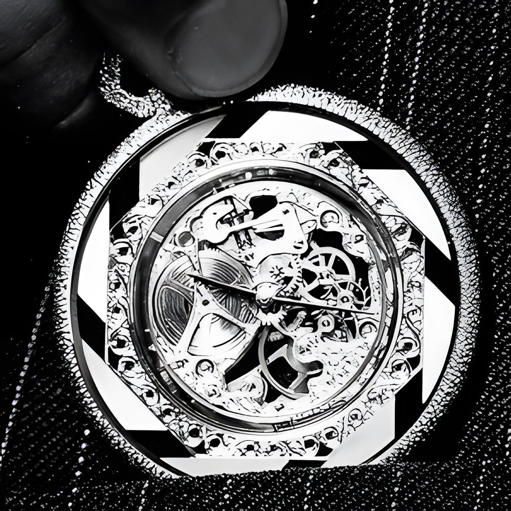 A superb example of the finest in horological traditions : the skeleton movement of this pocket watch is entirely openworked and decorated by hand; it is framed in onyx and mother-of-pearl. Its gold case is also entirely decorated by hand. (LONGINES)