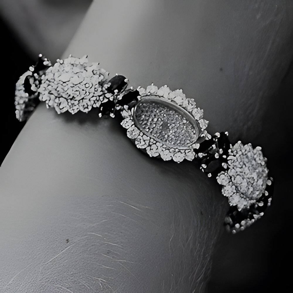 Dazzling “rivière”-type watch with oval bracelet links entirely paved with diamonds (202 in all, weighing 19.38 carats) set in yellow gold. They are connected by motifs set with 24 rubies (l7O1 carats). The dial is also entirely set with diamonds. (ROLEX)