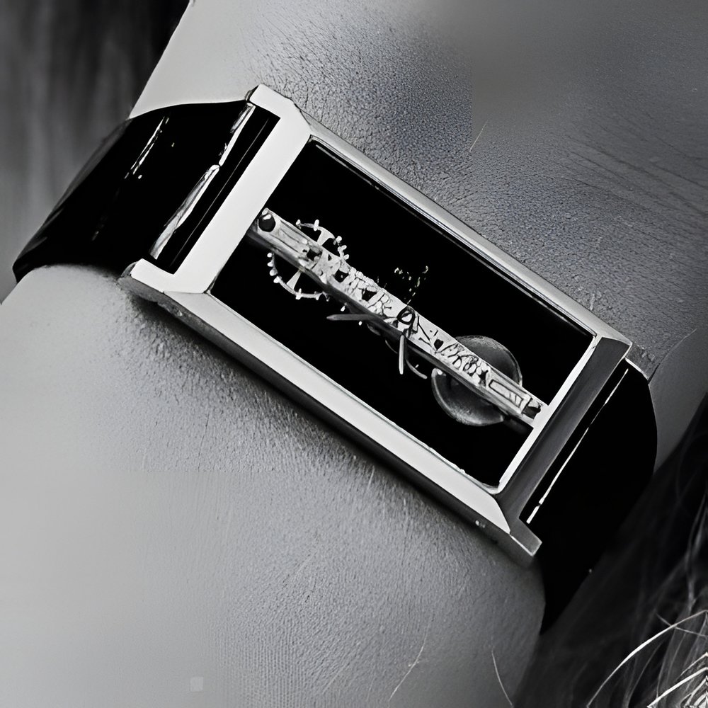 A technical and aesthetic creation premiered at “Montres et Bijoux” 1979 : the “line” movement (a VICA invention patent applied for) It is the world’s first small-size watch movement in which all components - which are visible - are arrayed in line0 Made in yellow gold, the movement doubles as the watches central decorative element. Th watch itself is available in 18K gold or in transparent, facetted man-made sapphire. (CORUM “Golden Bridge”)