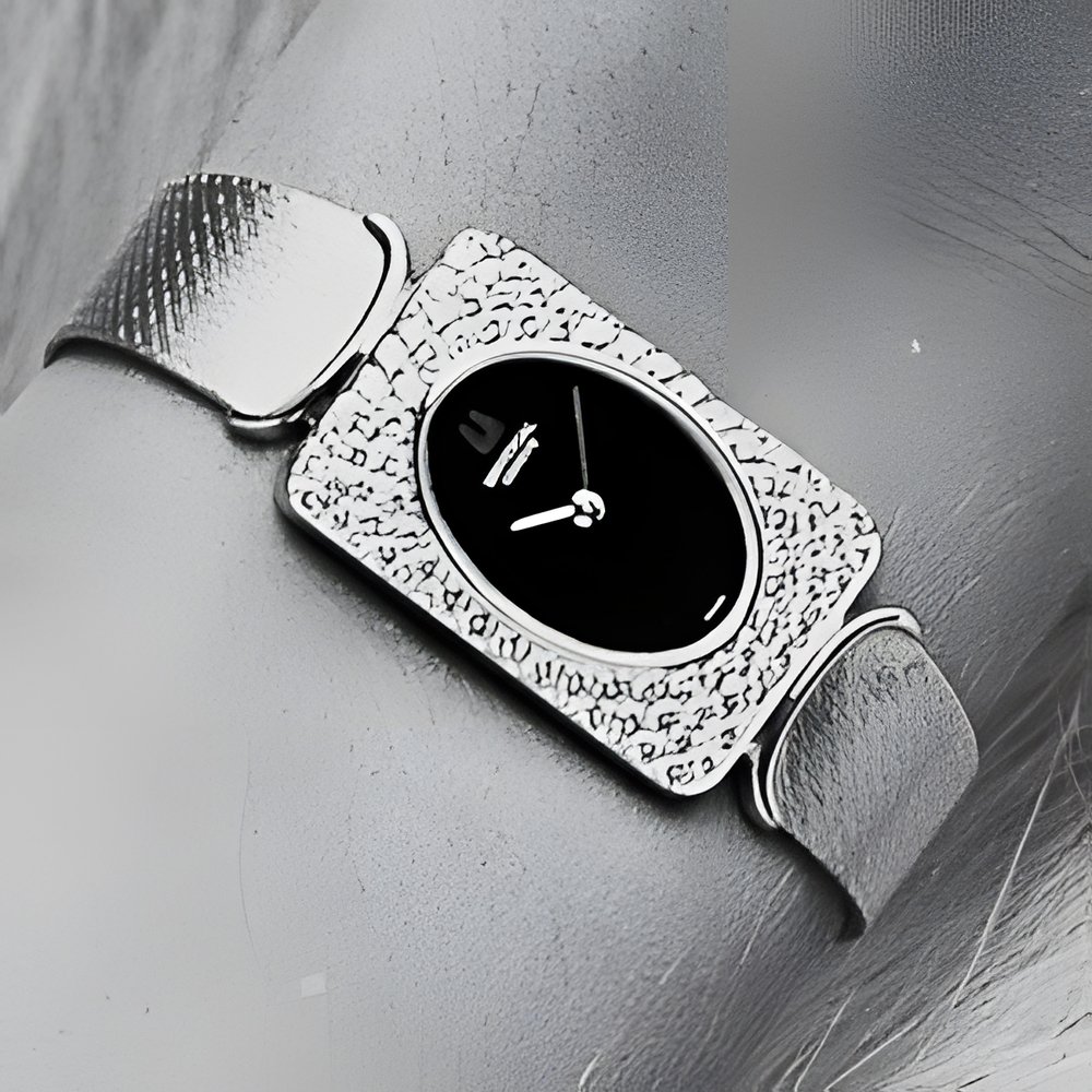 Neat, uncluttered styling. The broad white gold rectangular case, entirely paved with diamonds, contrasts elegantly with the dial’s soft oval lines. The Milanese mesh bracelet is also made of white gold. (UNIVERSAL GENEVE)
