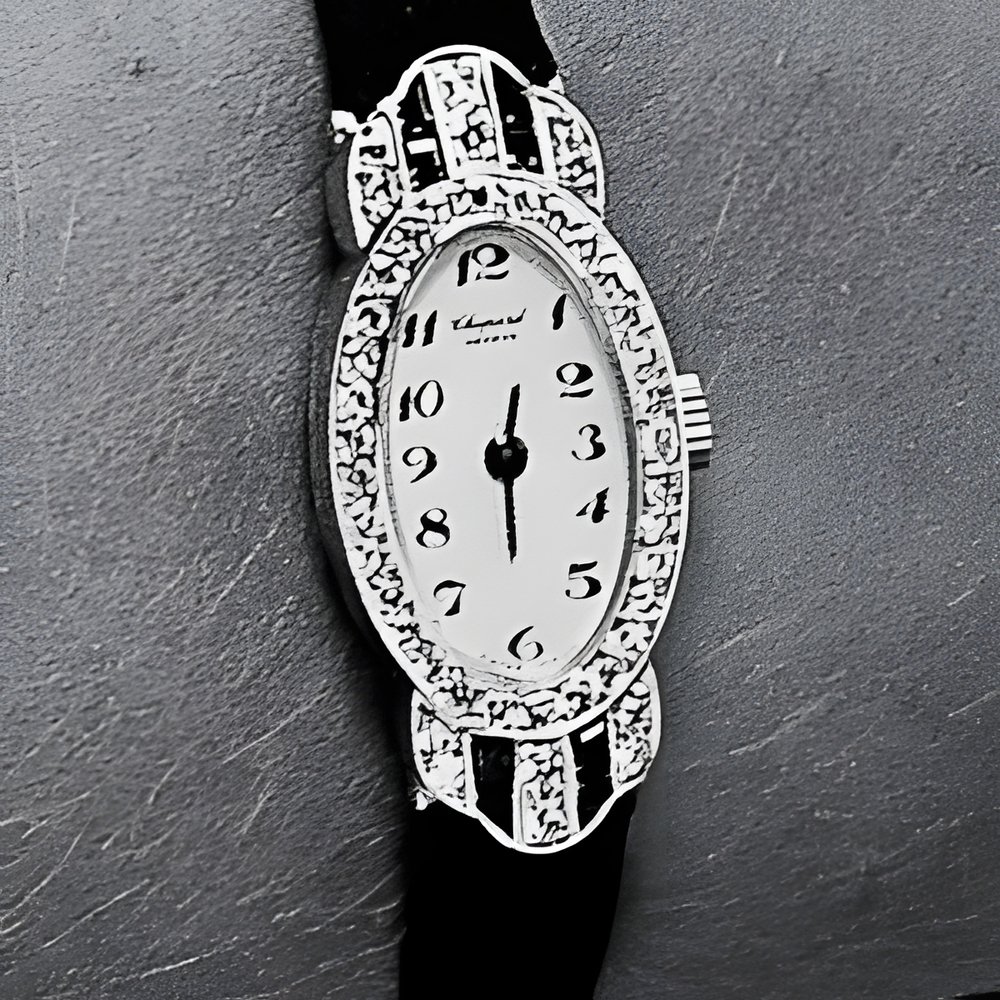 Graceful jewellery watch inspired by the Art Deco style of the 1920’s0 Oval dial with twelve Breguet numerals. The motifs linking the satin bracelet to the case are yellow gold, set with diamonds and ruby squares. (CHOPARD GENEVE)