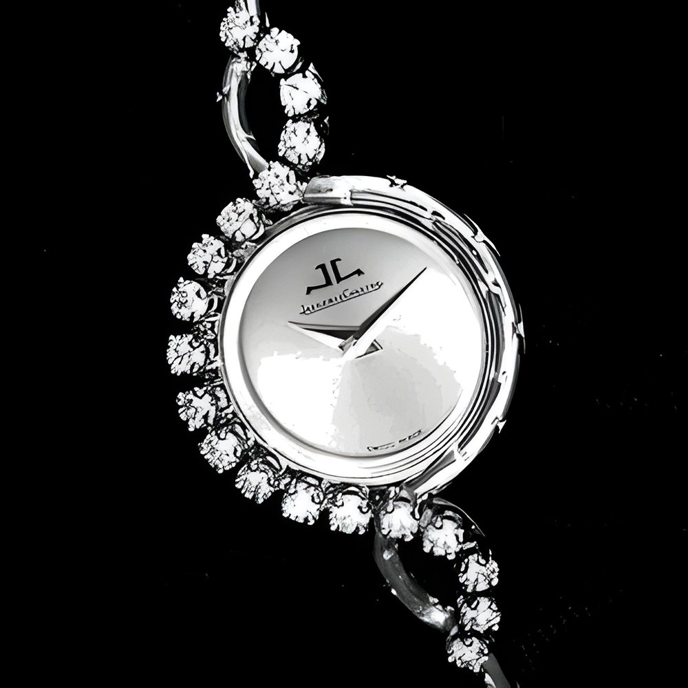Jewellery watch in yellow gold featuring one decorative element composed of white gold claws holding 19 flawless Top Wesselton brilliant-cut diamonds totalling 0.50 carats. The elegant, graceful bracelet continues on part of the case. It features a safety clasp out of which - purely to please the eye - two strands of the bracelet emerge. The movement’s winder is located under the case. (JAEGER-LECOULTRE)