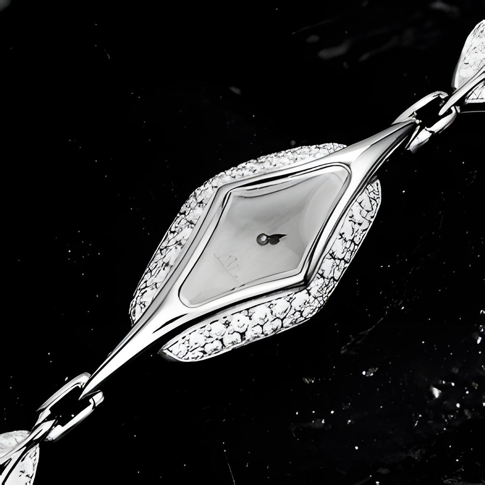 White gold jewellery watch. Its case and bracelet links elongated in form - are adorned with 138 flawless Top Wesselton brilliant-cut diamonds connected by small gloss-polished elements. The convex sapphire watch crystal is cut in oblong fashion like the case. The 2" handwound movement fitted in this prestige design is the world’s most compact. The winder is located under the case. (JAEGER-LECOULTRE)