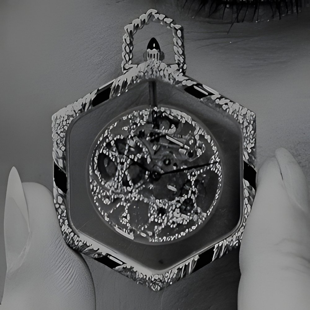 A gracious pocket watch with six-sided case, also wearable as a pendant. The frame, with round cross-section, is engraved 18K yellow gold set with onyx and brilliant-cut diamonds. At centre, a “skeleton” movement, entirely openworked, engraved and gilt by hand. (GIRARD-PERREGAUX)