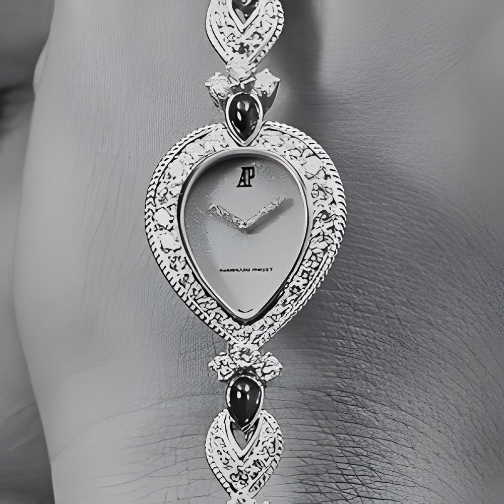 A jewellery watch by Audemars Piguet. The bracelet links, heartshaped like the case, are completely engraved by hand and set with brilliant-cut diamonds. They are linked together by motifs adorned with more brilliant-cut diamonds and a cabochon-cut ruby. 118 diamonds (5.34 ct) and 10 rubis (8.83 ct) in all., set on yellow gold. Even the hands are set with diamonds. (AUDEMARS PIGUET)