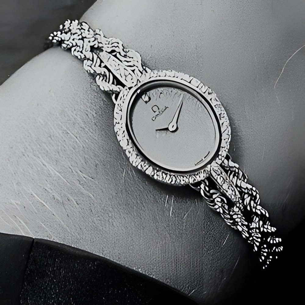 Mounted on a chain, this lady’s watch is crafted in 18K white gold. The dial frame and bracelet links feature diamonds set in yellow gold, as is the diamond at 12 o’clock on the frosted white gold dial enlivened with yellow gold hands. (OMEGA)