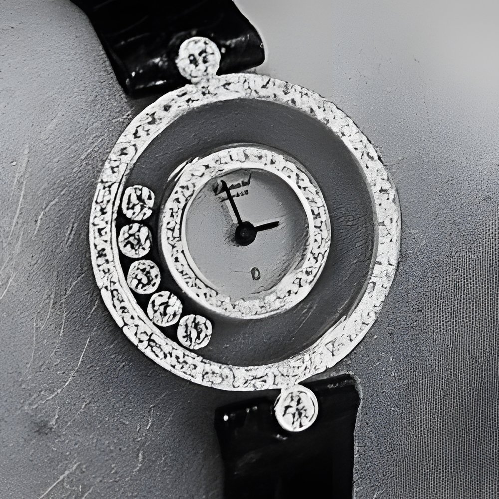 The first skeleton-type watch in the well-known “Happy Diamonds” style patented worldwide by Chopard Genève. Thanks of the compact dimensions of a miniature quartz movement, the brilliant-cut diamonds move between the watch’s two diamond-studded bezels, seemingly rolling and tumbling freely on the skin. In 18K yellow gold. (CHOPARD GENEVE)
