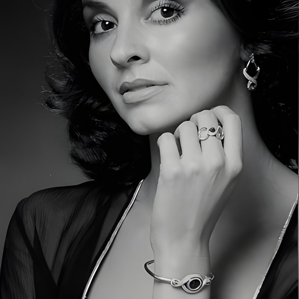 This set designed by Longines comprises a “Marquise” type quartz watch with rigid bracelet, in 18K yellow gold, ear pendants and a ring, also in yellow gold and set with onyx cabochons. Note the long lean lines of the watch with round dial. (LONGINES)