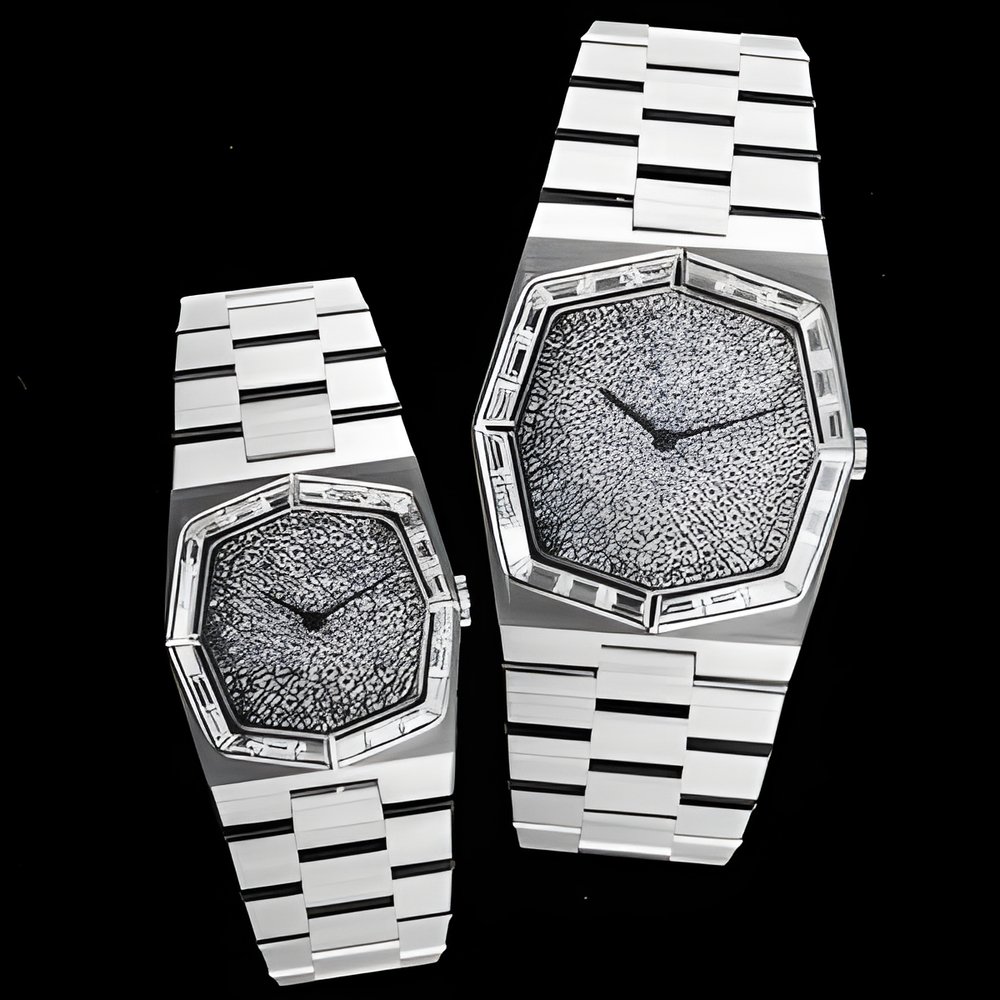 Two models form the new Rolex Cellini Collection. Perfectly ’integrated styling inspired by both classic and contemporary aesthetics. Bezels are adorned with baguette diamonds and dials are entirely paveed with diamonds. Taken together, both models carry 7.27 carats of diamonds. (ROLEX)