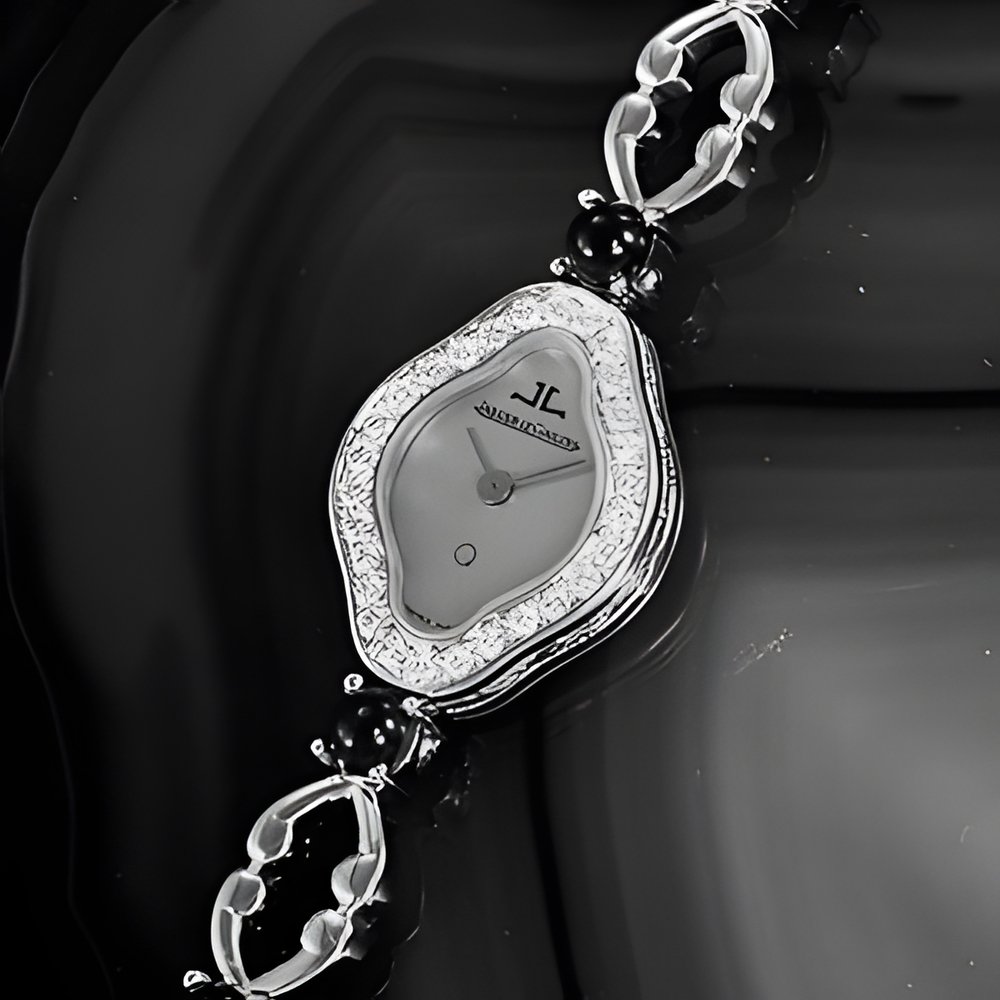 Case in 18K yellow gold with shaped dial aperture, set with 28 brilliant-cut, flawless Top Wesselton diamonds. The twinpatterned bracelet is adorned with claw-mounted ruby cabochons. Dial in 18K yellow gold. Extra-thin quartz movement. (JAEGER-LECOULTRE)