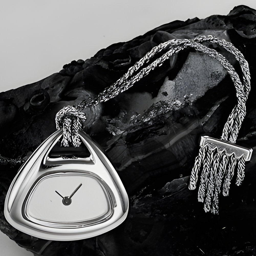 “Kimono” type pocket watch in 18K yellow gold shaped like a smooth pebble. 18K yellow gold dial, cabochon-tipped crown. The chain is also fashioned in 18K yellow gold. Extra-thin quartz movement. (JAEGER-LECOULTRE)