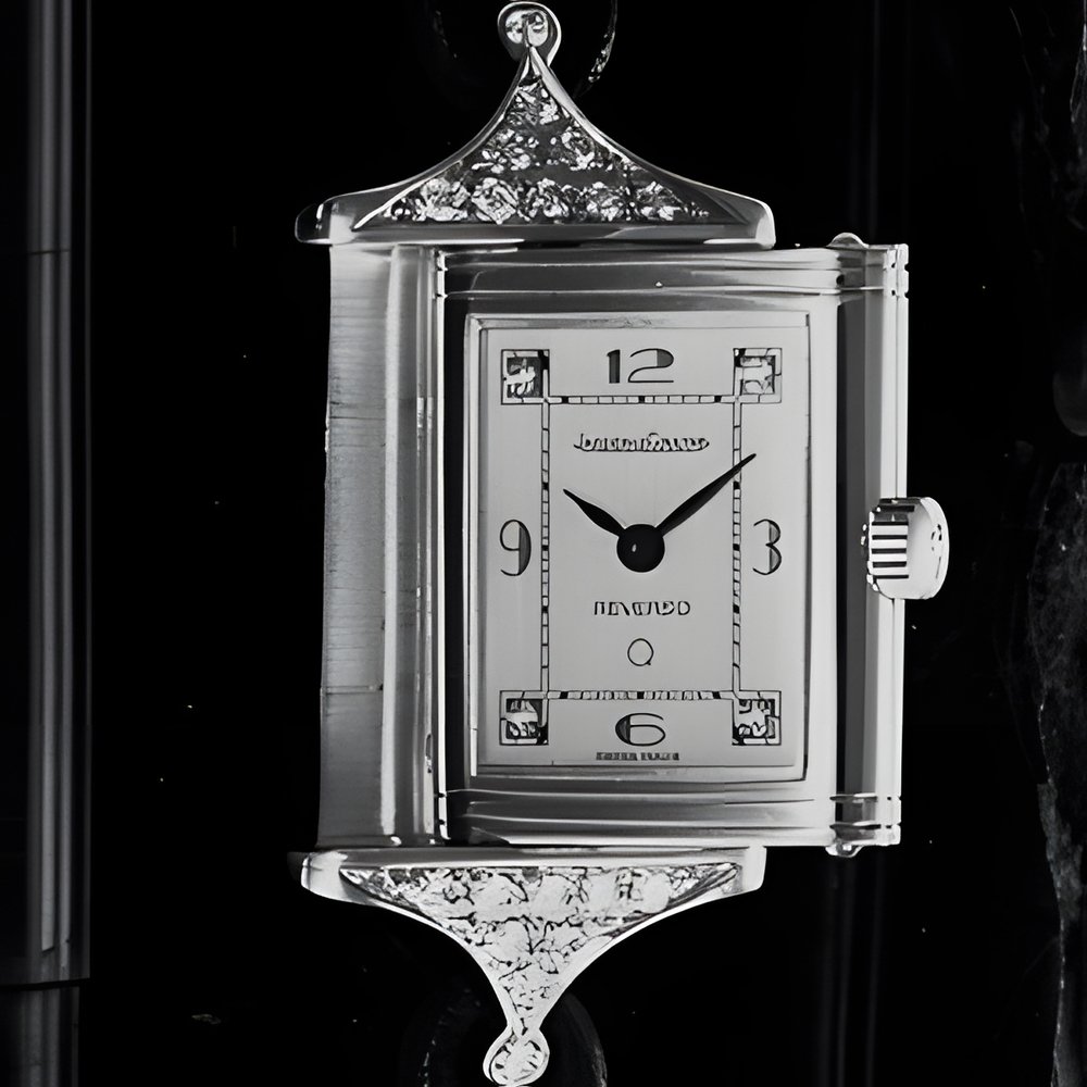 Nearly a half century after the man’s first came out, here at long last is the lady’s version of the famed “Reverso” design. Lean, modern lines with two decorative motifs set with 24 brilliant-cut Top Wesselton diamonds linking the case to the hand-rolled leather thong strap. Dial with 4 claw-mounted brilliant-cut diamonds. Extra-thin quartz movement. The back of the pivoting case can be engraved with a monogram on a coat of arms. (JAEGER-LECOULTRE)