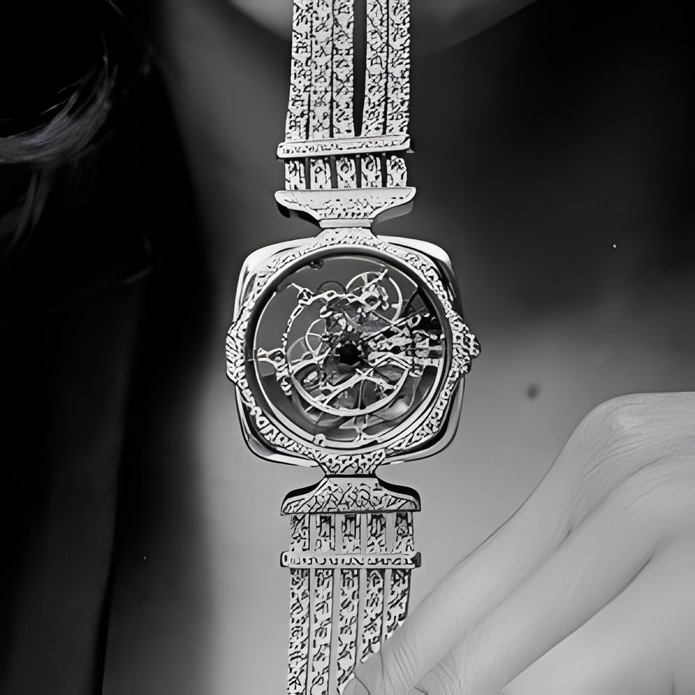 A dazzling “Skeleton” watch - a type enjoying a tremendous revival these days - whose yellow gold case and four-strand bracelet links are paved with 196 brilliant-cut diamonds (1.64 carats). The skeleton movement is a twin-barrel Longines 993 selfwinding movement. Entirely openworked, chased and engraved by hand, its beauty is protected by two scratch-resistant sapphire crystals. (LONGINES)
