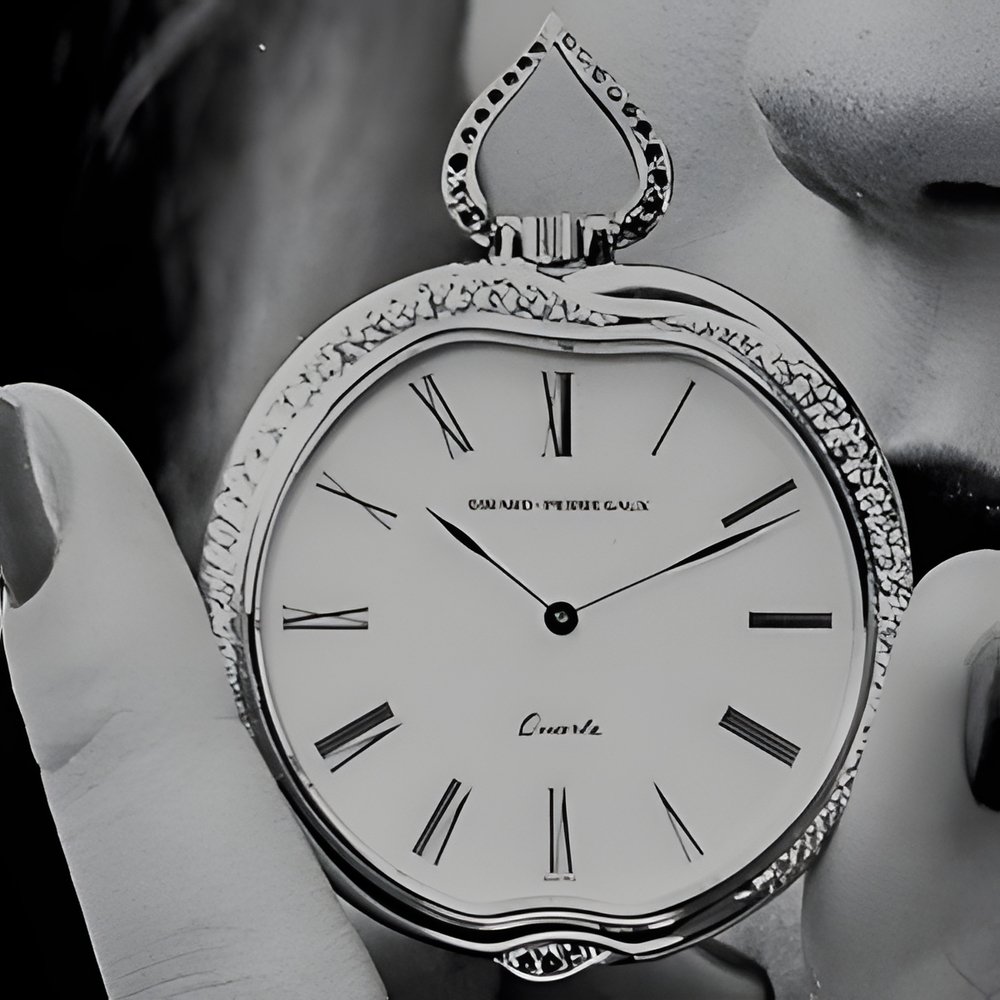 At "Montres et Bijoux 1981tt, Girard-Perregaux unveiled an impressive number of exceedingly stylish and original pocket watch designs fitted with a quartz movement. This apple-shaped model has a case in 18K yellow gold enhanced with tourmalines andbrilliant-cut diamonds. Enamelled dial. (GIRARD-PERREGAUX)