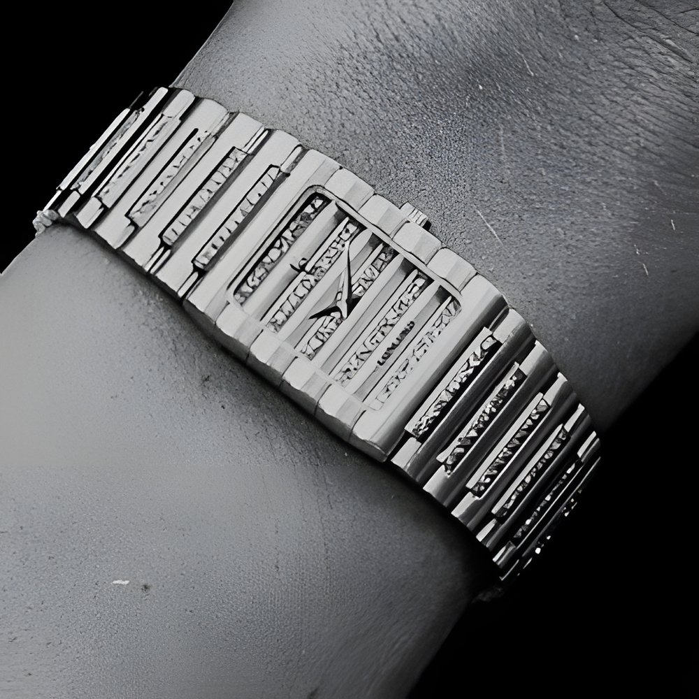 Very handsome, very luxurious, very very slim and extremely well protected is this Concord wristwatch with water-resistant yellow gold case. The bracelet and case display flawless integrated design and the pattern formed on the bracelet by brilliant-cut diamonds is repeated on the dial. (CONCORD “Centurion”)