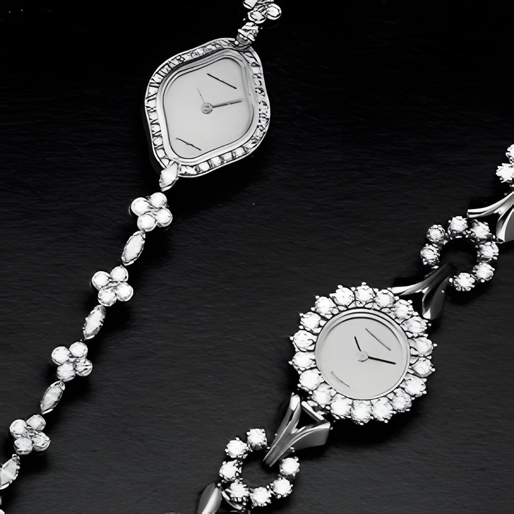 Right: jewellery watch with quartz movement. Case and decorative elements in 18K yellow gold. Further decor and dial frame in 18K white gold set with 88 brilliant-cut diamonds (4.16 carats). Left: jewellers watch with quartz movement. Case and bracelets in 18K yellow gold enhanced with clusters of 4 brilliant-cut and navette-cut diamonds: 82 brilliants weighing 1.69 carats and 15 navettes weighing 1.35 carats. The diamonds are pure lop Wesseiton. (JAEGER-LECOULTRE)