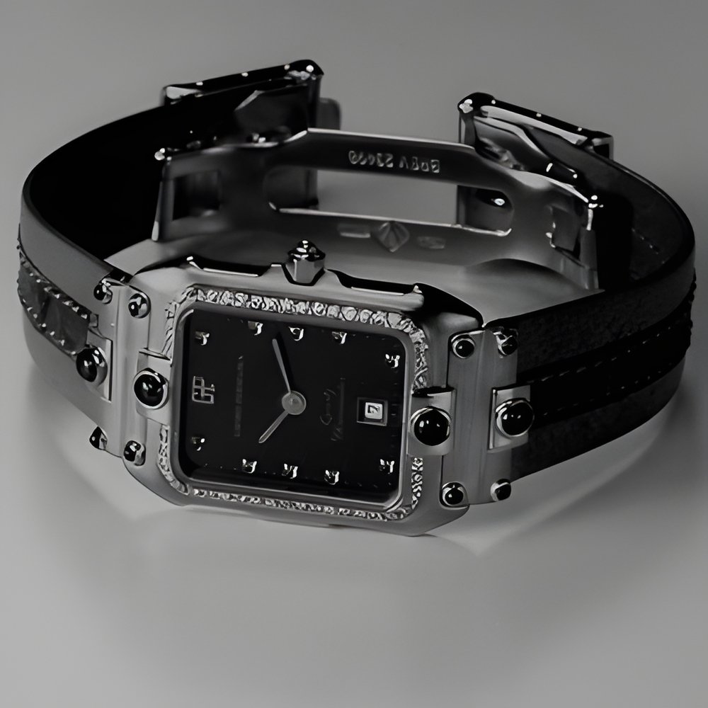 Lady’s quartz chronometer. Water-resistant case in 18K gold, enhanced with 4 sapphires and 8 rubies. Its bezel is set with diamonds. More sapphires grace its metallised dial and the bracelet’s original clasp design is also made of 18K gold. (GIRARD-PERREGAUX)
