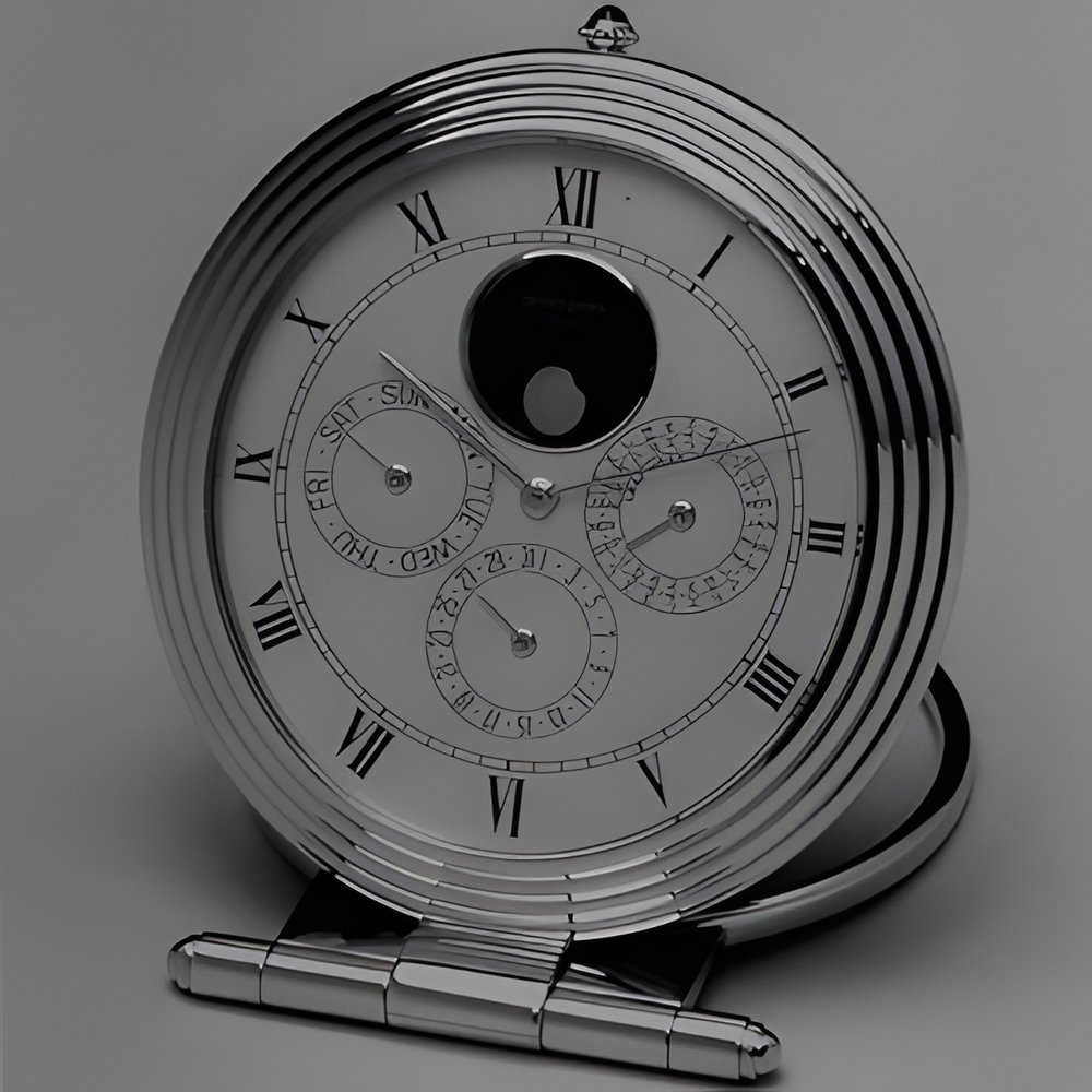 Small clock made entirely in 18K yellow gold. It features a foldaway base and its 8-day mechanical movement includes a perpetual and lunar calendar : a gold moon moving across a lapis lazuli ground. (GERALD GENTA)
