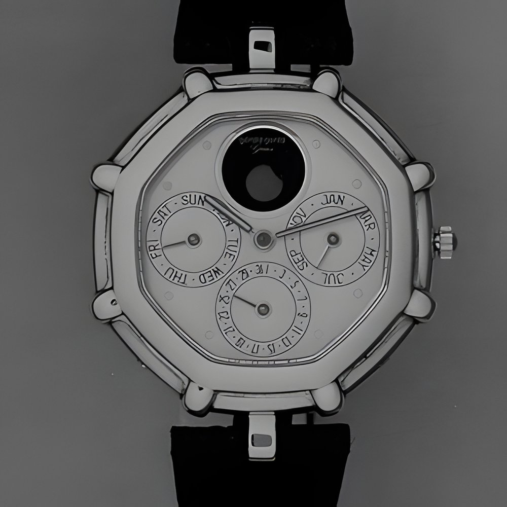 Gold & Gold - man’s water-resistant sports watch. It features a perpetual calendar showing the date, day, month and moon phases (in gold on a lapis ground). Its seifwinding movement is cased in 18K yellow gold. Note the centre link of the sharkskin strap. (GERALD GENTA)