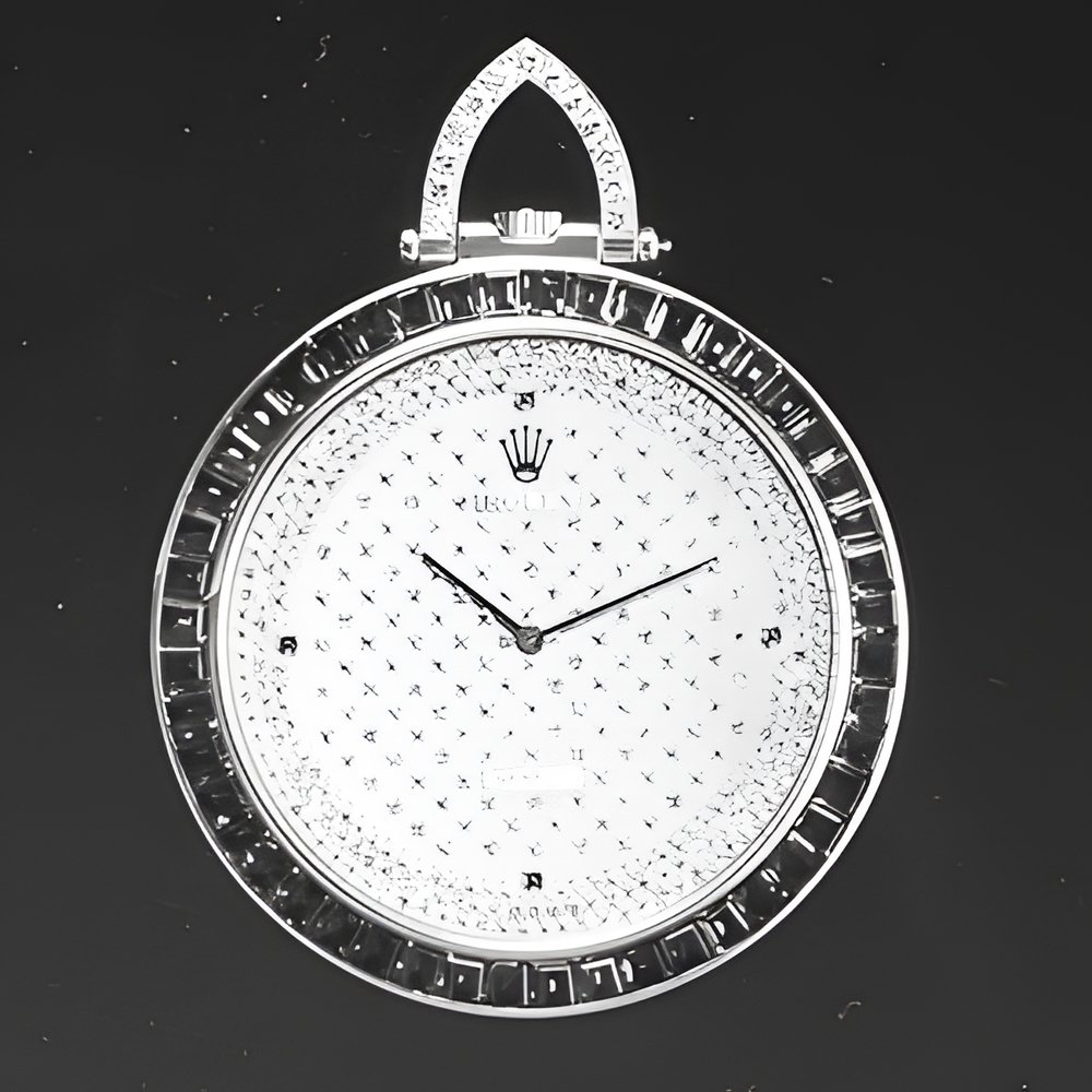 Classic in spirit, well proportioned and opulently decorated, this Rolex pocket watch features an 18K yellow gold case set with 48 ruby baguettes (9.79 et) and 11 brilliant-cut diamonds. The dial is diamond pavé (238 stones) with 4 rubies marking the quarters. (ROLEX)