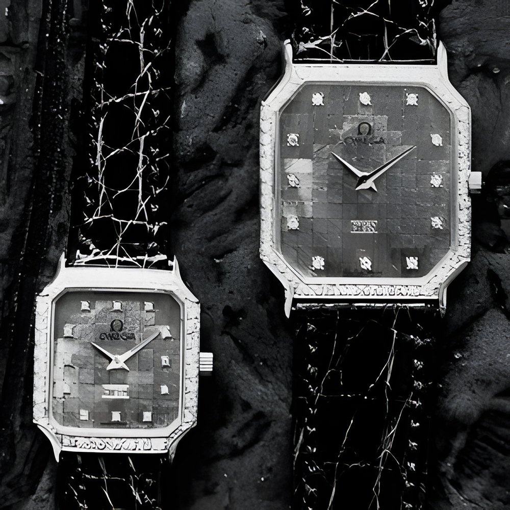 Two Omega timepieces made of one of the noblest of all metals : platinum. The same metal is used for the engine-turned, diamondstudded dials, protected by a scratch-resistant sapphire crystal. More diamonds enhance the cases. Alligator straps with white gold clasps, set with diamonds. (OMEGA)